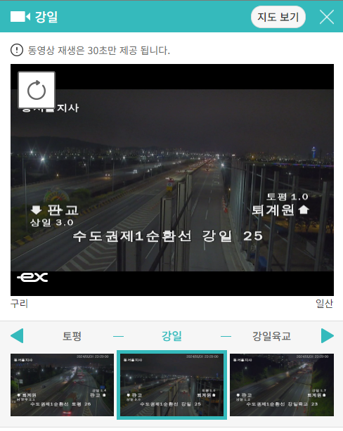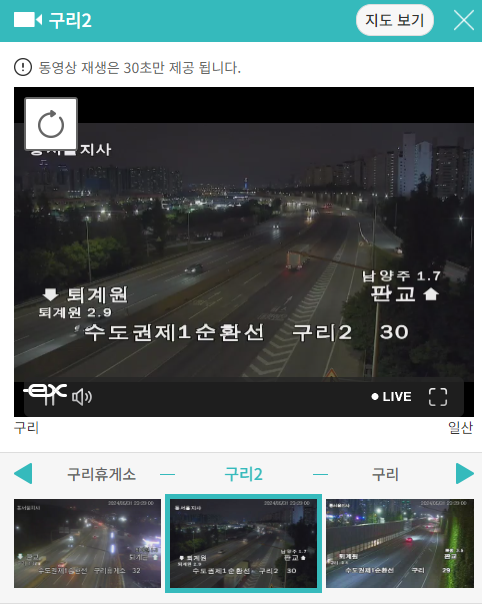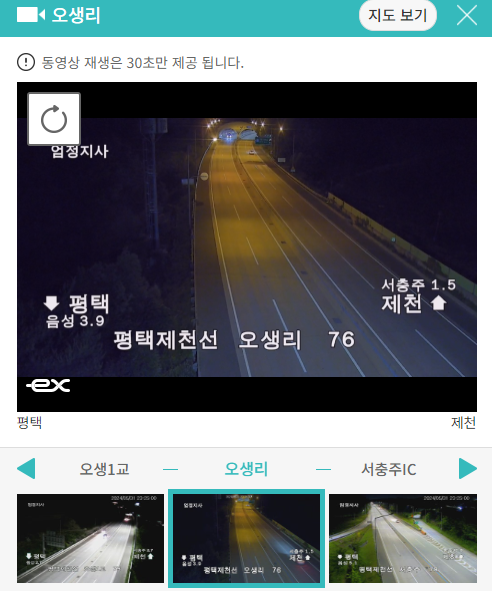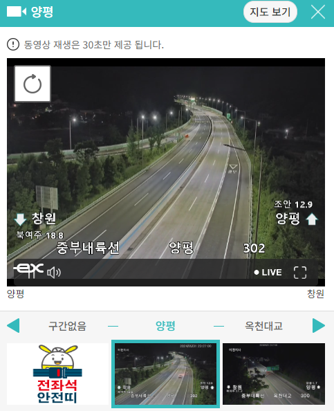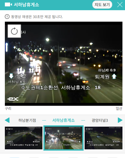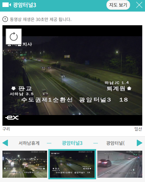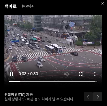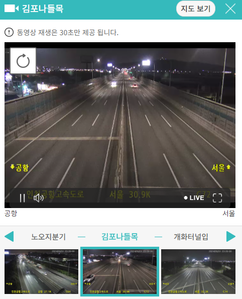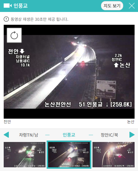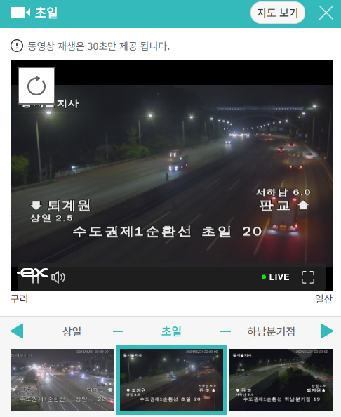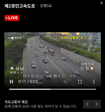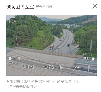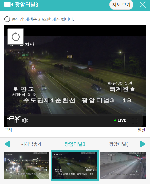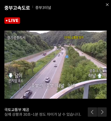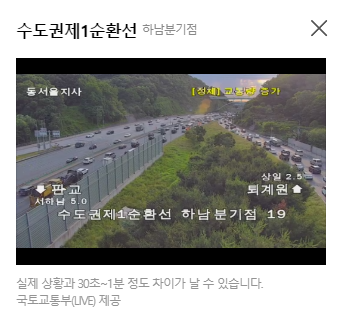 정체된 지역을 클릭하면 바로 실시간 교통상황을 CCTV를 보여주고 있어 현재 상황을 파악할 수 있습니다.