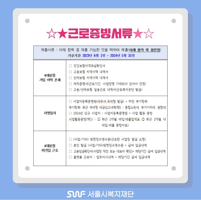 - 3개월 이상 일한 증빙서류를 제출해야 신청가능함